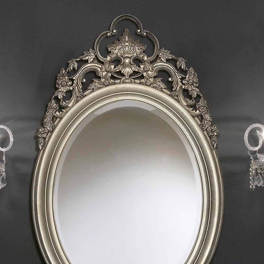 Het vorstelijke ontwerp wordt bekroond met een ingewikkeld ornament dat de spiegel bekroont, waardoor een visueel interessant punt en een gevoel van hoogte en grootsheid wordt toegevoegd aan de muur waaraan de spiegel hangt. De ovale vorm van het reflecterende oppervlak biedt een zacht en uitnodigend zicht, ideaal voor ruimtes waar u een gevoel van intimiteit en verfijning wilt toevoegen.