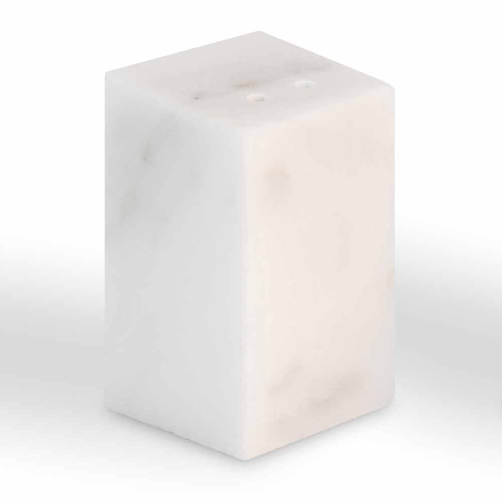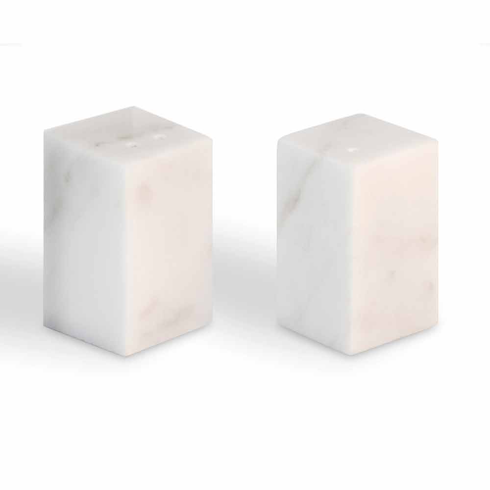 Keukencontainers voor zout en peper die worden gekenmerkt door het gebruik van wit Carrara-marmer en die als unieke stukken moeten worden beschouwd , aangezien elk blok marmer dat wordt gebruikt verschilt van de andere voor aders en tinten.