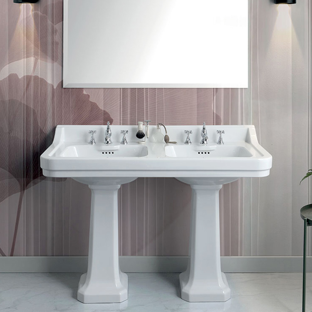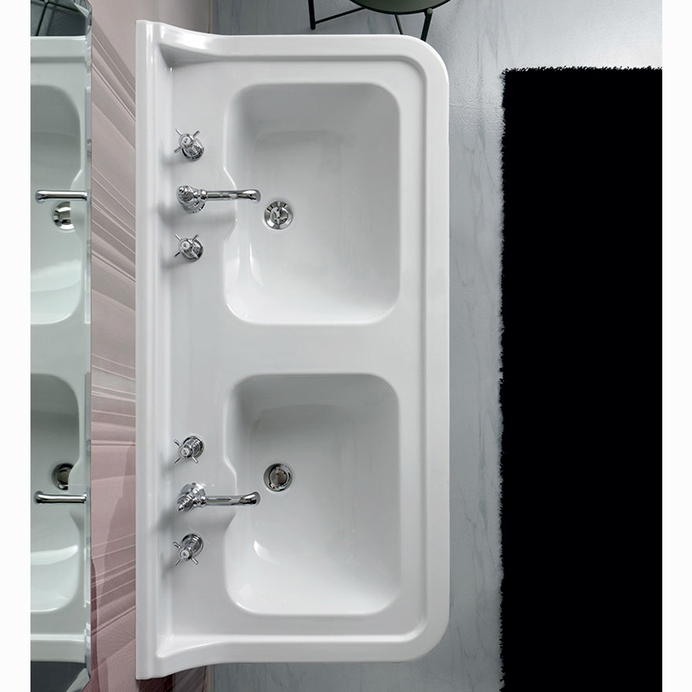 Console wastafel met dubbele wastafel gemaakt van glanzend wit keramiek door een 100% Made in Italy ambachtelijke productie . Een meubel dat klassieke ontwerpen van weleer tot leven brengt om even klassieke badkamerruimtes met karakter in te richten, maar ook moderne omgevingen om te spelen met originele en ongekende stijlcontrasten .