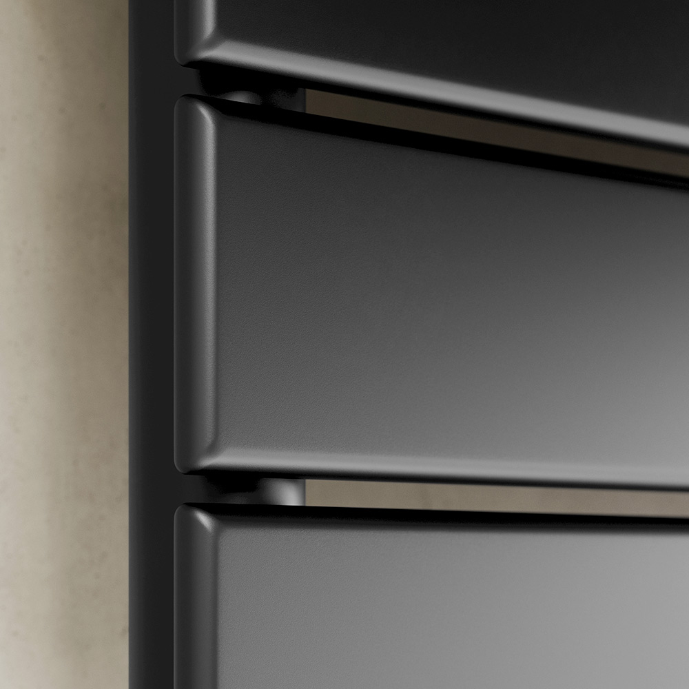 Deze zwarte handdoekwarmer vertegenwoordigt pure elegantie en verfijning in elk detail. Het moderne ontwerp en de strakke geometrische lijnen voegen een vleugje eigentijdse stijl toe aan elke badkamer en passen perfect bij verschillende decoratiestijlen, van de meest minimalistische tot de meest gedurfde.