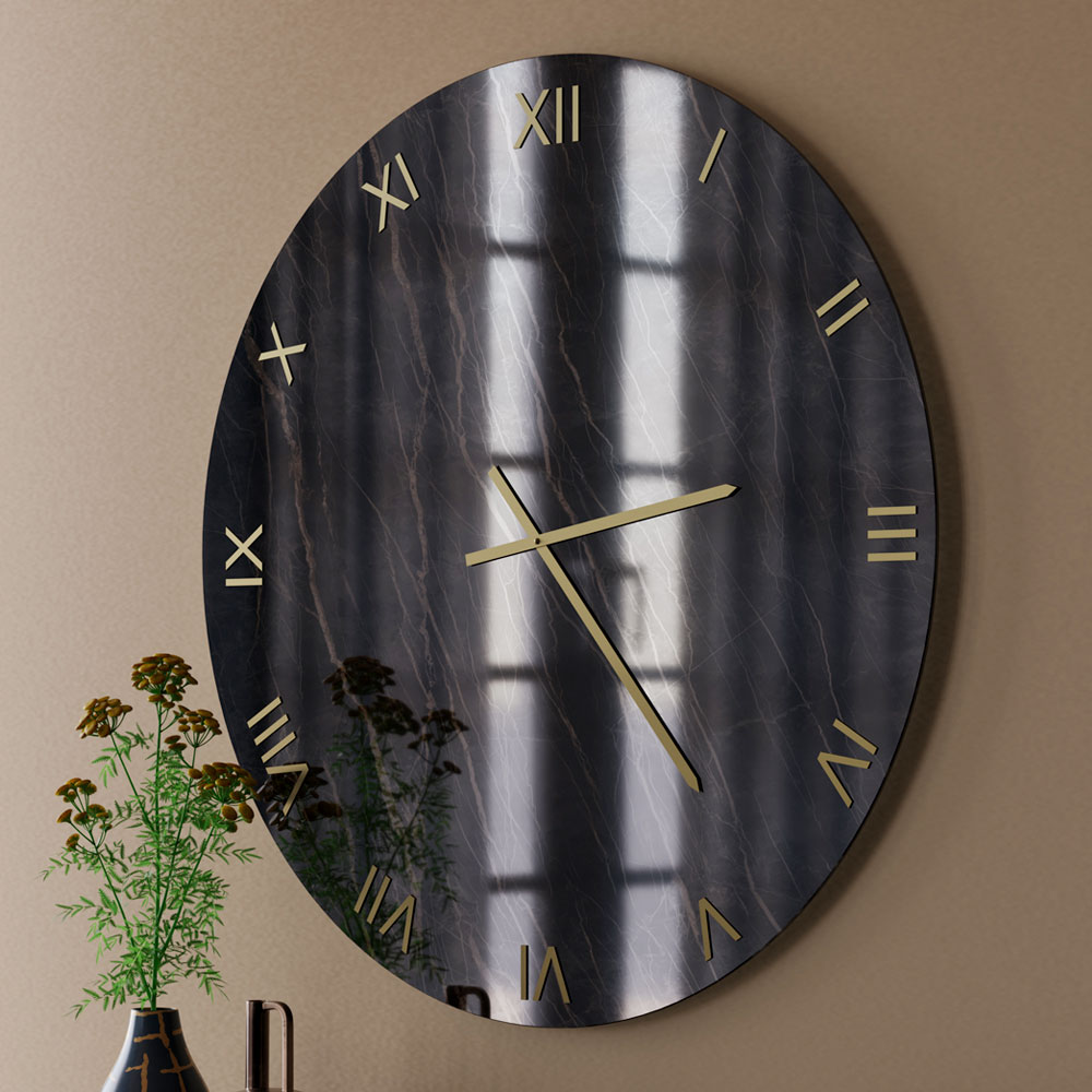 De glazen wandklok met een zeefdruk in zwartgoud marmerlook is een opvallend woonaccessoire, ideaal voor elegante en eigentijdse interieurs. De donkere achtergrond, onderbroken door verfijnde nerven geïnspireerd op zwartgoud marmer, geeft de ruimte visuele diepte en een krachtig karakter.
